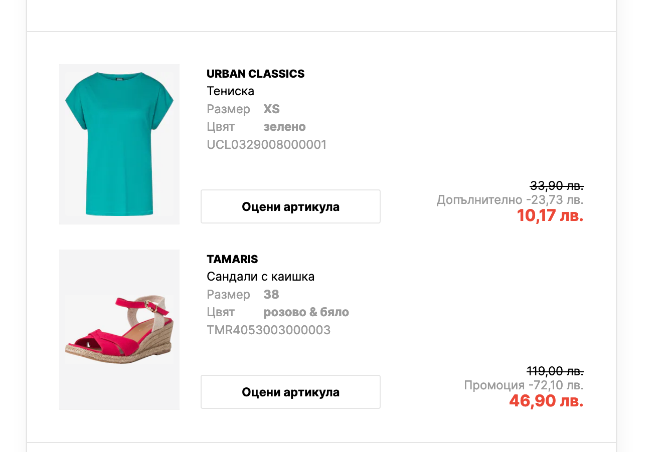 Чакам тези: сандалите се изчерпаха, бяха само 1 номер, а блузата е 100 % памук, уголемена е, ето линка, има и други цветове https://www.aboutyou.bg/p/urban-classics/teniska-4239505 , една част от цветовете са намалени. В червено е 7,17 лв.