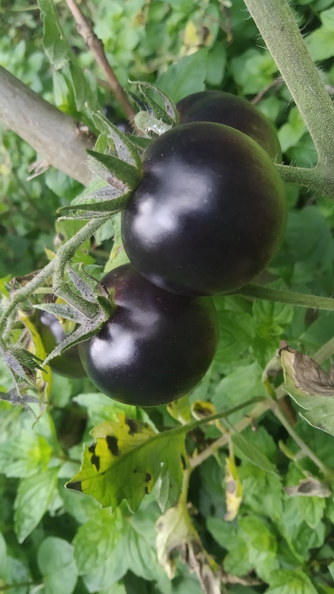 Най- тъмни са т. н. "сини" домати (не са патладжани 😃). Тази част от тях, която е огрява от слънцето, става почти черна, има и места с тъмно червено. От вътре са с нормален червен цвят. Май всички са дело на американски селекционер. Не знам да продават у нас семена от такива сортове. Купуват се от нета или се разменят семена с други хора. Аз имам един сорт с нормални по размер домати и едно чери, което явно не е много стабилно като сорт. Като цяло са по-късни. Ето как изглеждат.