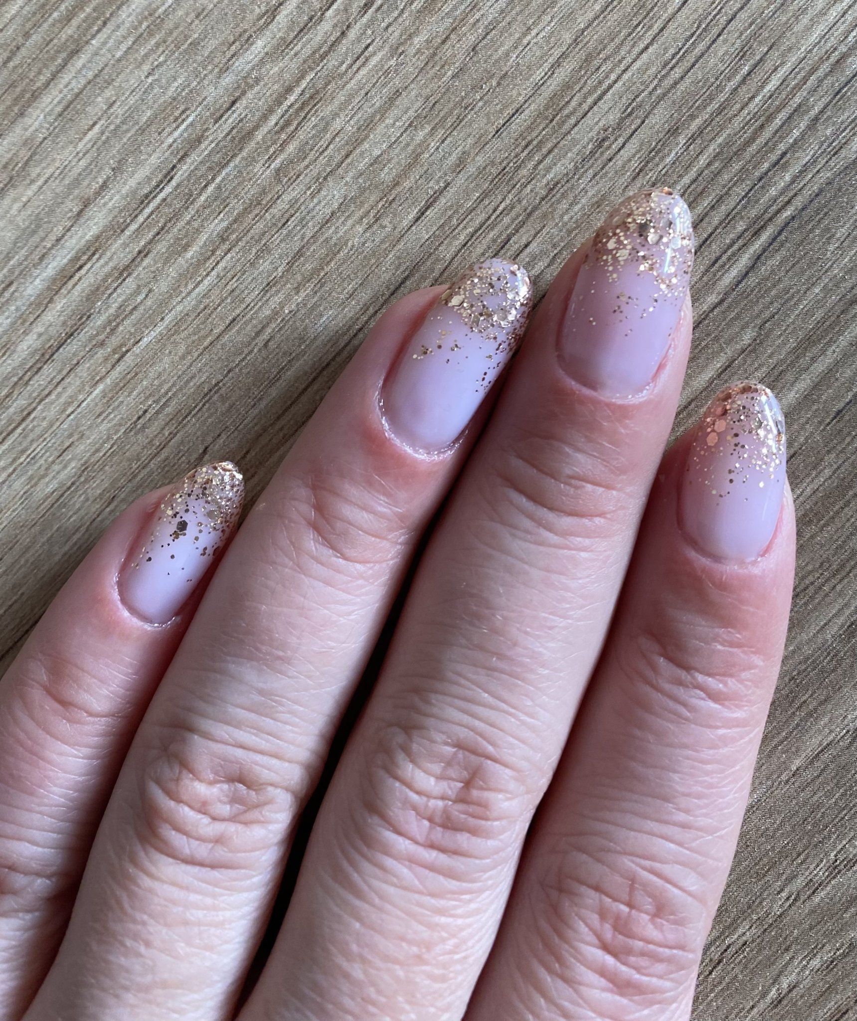 Идвам и аз с маникюра от вчера. Няма да повярвате… пак е френски 🤣 Правя, каквото правя и накрая пак млечната база, вграден брокат и френски. 😀