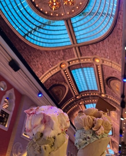 Сладоледа е чудесен, препоръчвам да се опита, 5.00 евро са две големи топки, 2 евро е вафлена фунийка.