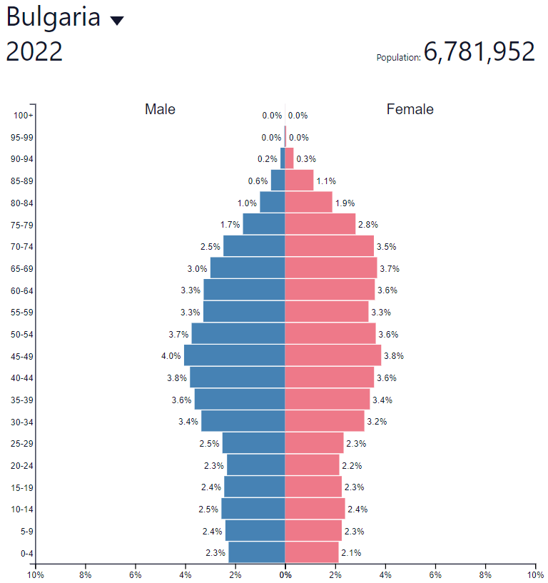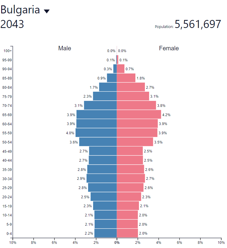 Инак що ли има социален натиск хората да се женят и да раждат деца - ами кой ще гледа старите иначе? Всички тук ще остареете, викате "аз и сама съм си достатъчна" ама кой ще ви плаща пенсиите - нали трябва да има млади, които да внасят осигуровки, че да вземате вие пенсии? Извън самия въпрос за парите, нали трябва да има и физически брой хора да ви изорат и ожънат хляба, да ви заколят кокошките и прасетата, да шофират камионите, които ще ви ги доставят, да ви поддържат жилищата, и всичко онова, от което ще имате нужда като остареете? Ето как изглежда пирамидата на населението в момента: