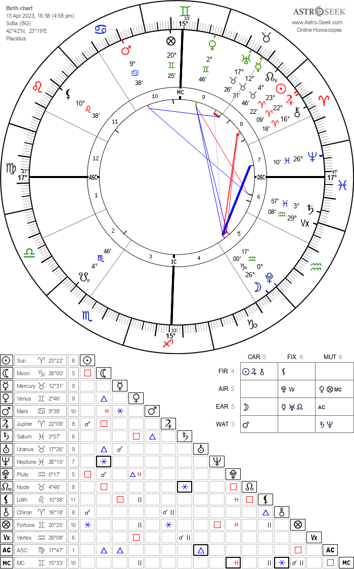 Карта с асцендент на 21* във везни е нерадикална и не би следвало да се разглежда. В случая пък имаме и карта с луна без курс в последните градуси на козирог. Другото ще са свободни съчинения и изкривяване на изводите.