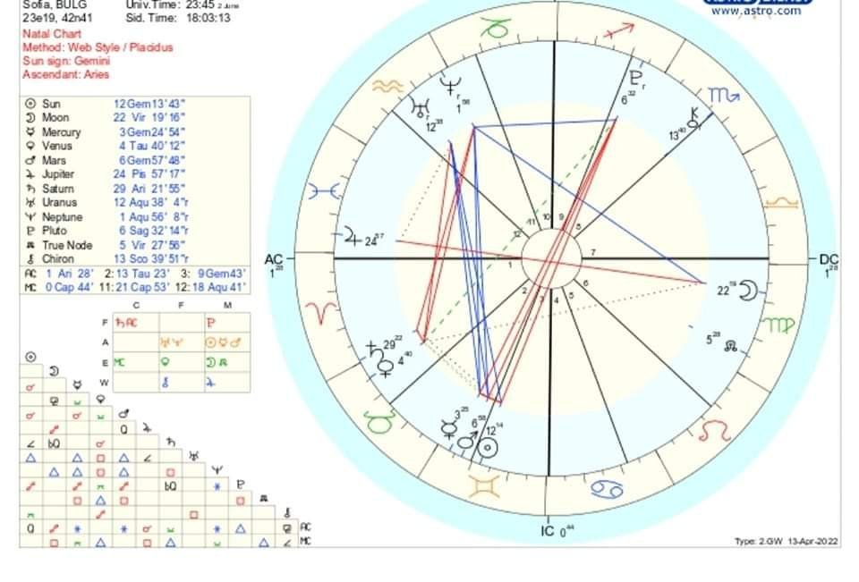 В тази карта изначално има указания за някаква проблематика в личен план и във връзките – Венера и Марс съвпадат заедно с Кету, отделно от това имат квадрат със Сатурн в 7ми дом. Тъй че дотук каквото си е надробил, това ще сърба по време на сатурново завръщане. Ако по други методи няма указания за партньорска криза, може да мине и без много щети този транзит.