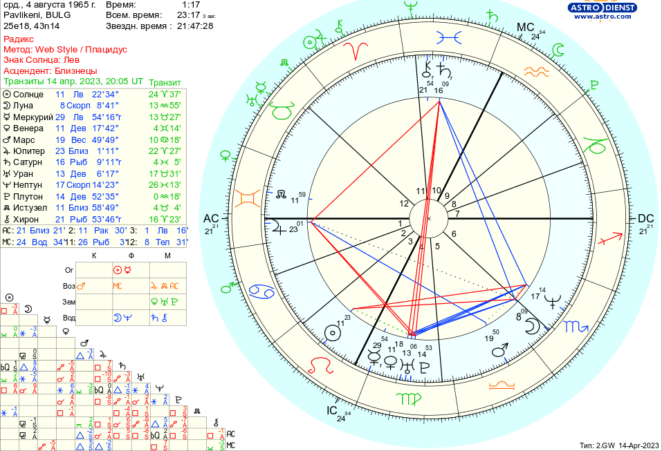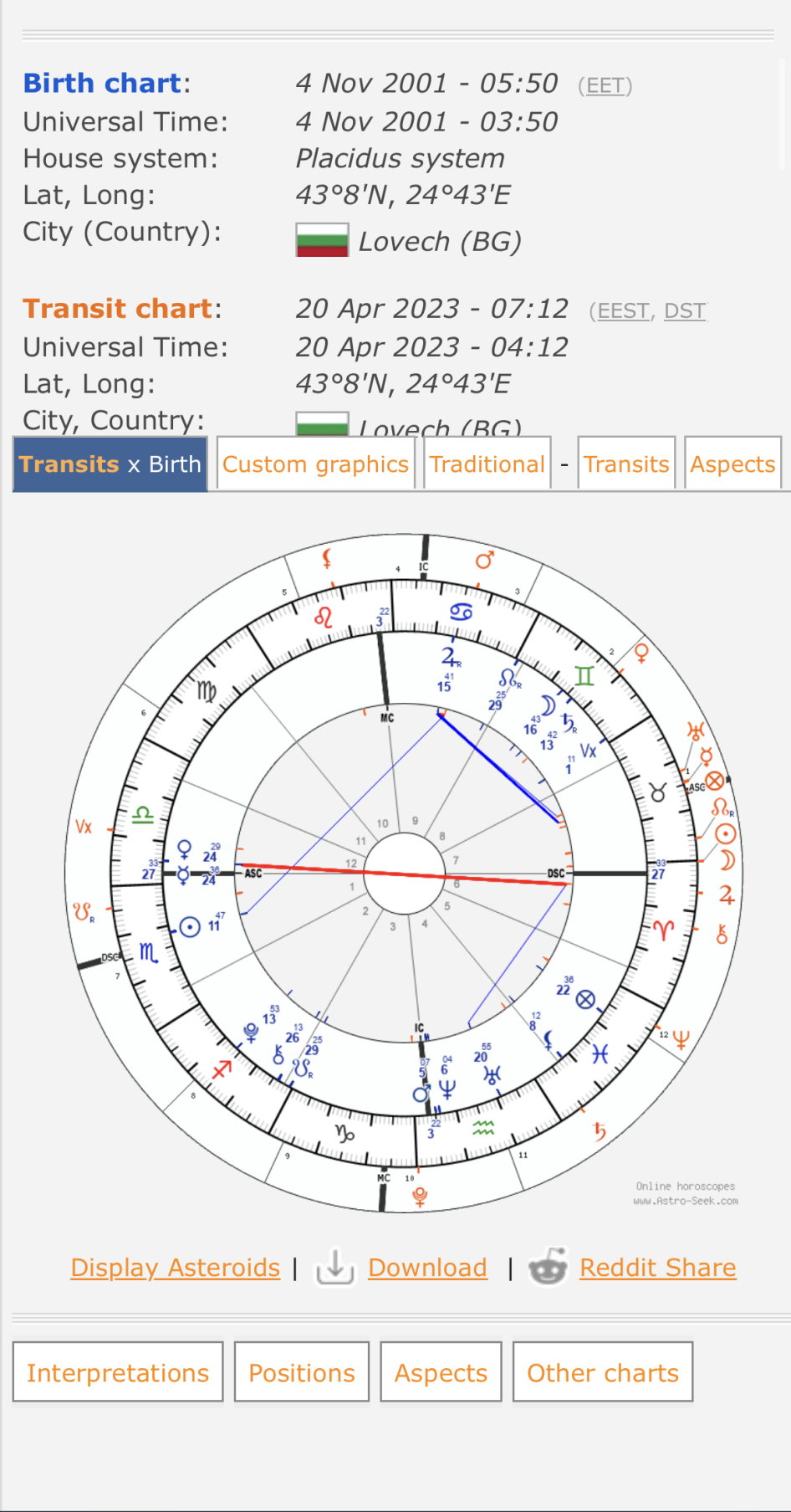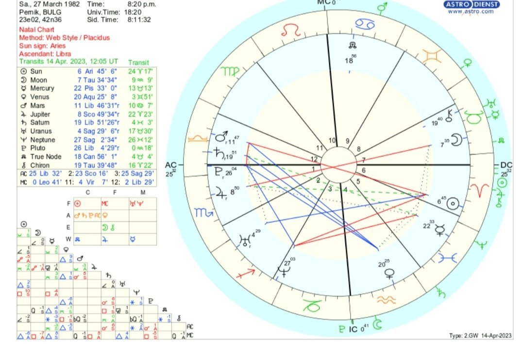 Здравейте, някой може ли да ми каже дали правилно съм генерирала наталната си карта така, че да е изобразен транзитът на 20.04.2023г.? Целта ми е да видя кои аспекти ще засегне слънчевото затъмнение в овен? Извинете , ако имам грешки някъде или е засягана темата, но не открих друга обща тема. Ще бъда благодарна!