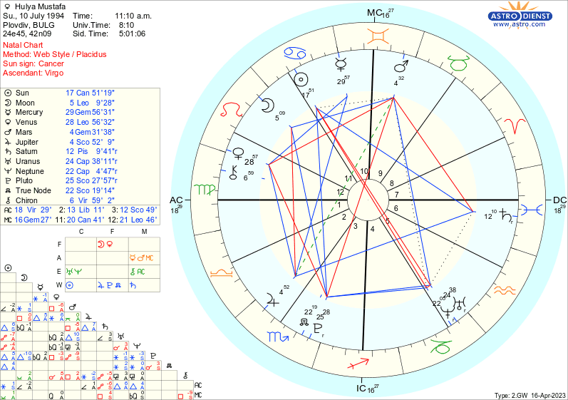 Много пъти сме говорили, че 1. прогностиката си е доста сложна и времеемка и 2. така по един транзит, без разглеждане и указания по още няколко прогностични метода, не се правят. Форумът не е място, където просто може да се покаже една карта и десетина души да се изредят с предположения какво ще се случи на човека. Най-малкото не се знае картата на мъж или на жена е. Няма нужда да се трие картата. За нас тя не е никаква тайна, а просто една картинка. Нативът не е разпознаваем. Часът на раждане от къде се знае? Редовните читатели на темата, би трябвало да знаят, че за анализ на карта минутките не са от значение, но за прогностика, по метода градус-година, тези минутки могат да дадат голямо отклонение. Аз не се наемам буквално да гадая по карти, ако няма ректификация на часа.