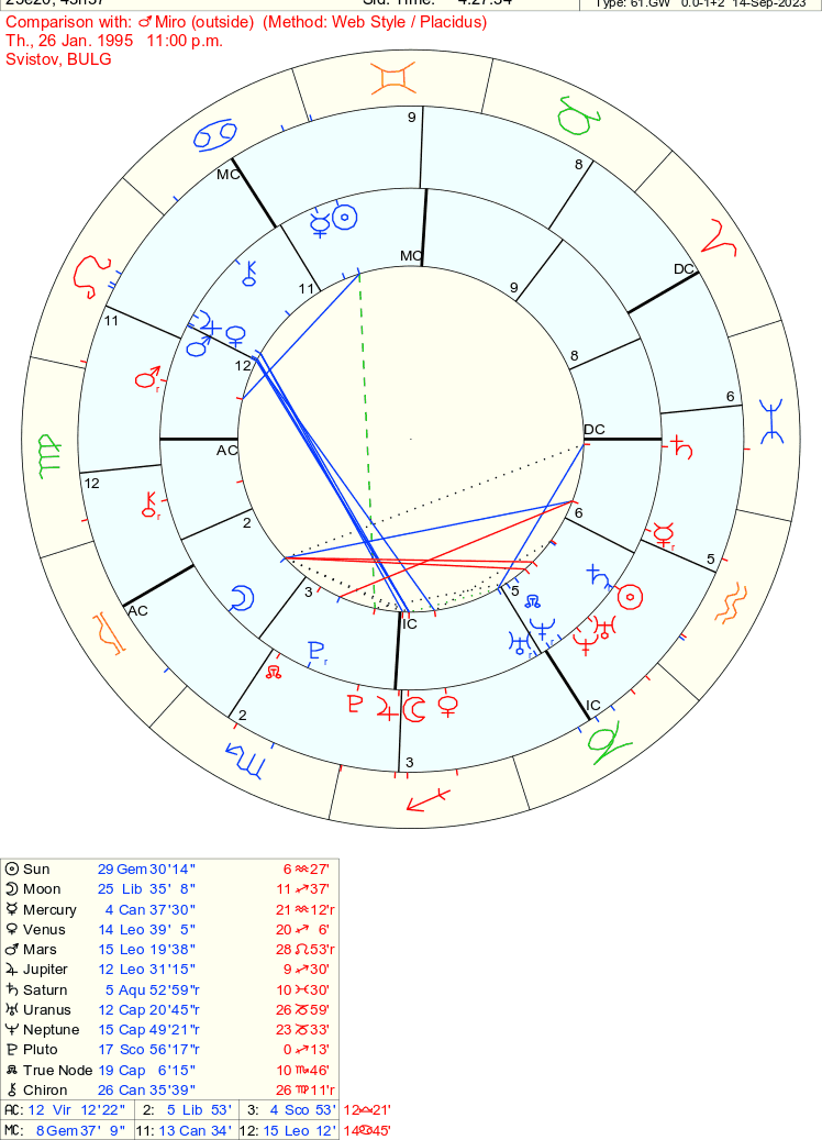 Благодаря ви.Да,в неговата карта има Марс ретро в 29 градуса в лъв квадратура с Плутон и като цяло е човек,който е много лесно избухва,трудно се контролира,психопатски наклонности и зависимости има и т.н.Аз съм доста уравновесена и мека като личност,луната ми във везни винаги ме прави много любезна и мека,за съжаление самата аз съм доста неотстъпчива когато става въпрос за моите си неща и принципи,и мекотата ми също рязко се променя когато някой се опитва да ме мачка,ставам ужасна.Нищо не коментирайте за моята квадратура Плутон и триото в лъв,това е аспект който много трудно мога да отделя като влияние защото действа постоянно и почти навсякъде около мен като фон,имам проблеми и с близките ми,често попадам на психопати и луди хора,близките ми също са манипулативни и  контролиращи,това са неща които мразя и ме вбесяват,много държа на свободата и на съобразяването с другите,но почти не срещам такива личности,все са другия типаж..Благодаря ви за съветите,ще направя това защото нямам избор така или иначе.Използвам всякакви методи за прогнозиране,естествено не само транзити,но ми беше чудно какво се задава при този аспект,не съм наблюдавала подобен,търсих информация но няма такова,при мен и двете планети са много силни в моята карта и са си на трон,имам доста събития по тях нищо че не са на асцедента ми,Плутон си е в трети,управител на Трети в собствения знак,Сатурн ми е в пети,управител на пети във Водолей,управител ми е на уран и Нептун в съвпад в Козирог,на северния лунен възел и Лилит...та нещата са доста навързани.