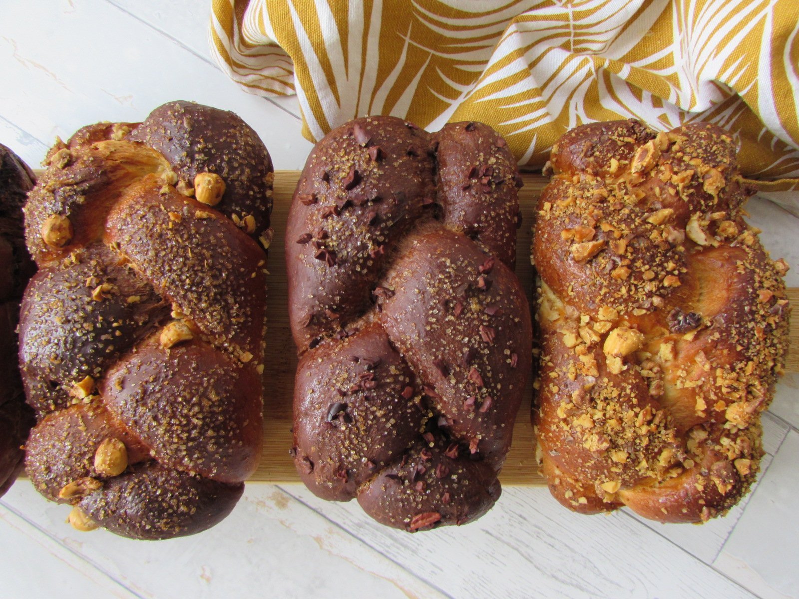 Част от продукцията. Традиционен с дълго втасване, шоколадов с капки, шоколадов с лешници и с течна плънка от какао, белтъци и орехи. Всички са с различни плънки и поръски, защото правих за родителите ми, за родата, за колежките на сина ми... Това, което установих, че шоколадовите са по-вкусни на втория ден. Остана един традиционен с течна плънка от какао и орехи, който забравих да снимам а и почти го няма. Grinning
