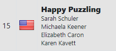 Карън се записа най-сетне на световното. Ще бъде в отбор с някаква Елизабет, не се сещам коя е. Отборът им е Happy Puzzling и влиза отново въпросната Елизабет, Сара Шулер (завърши втора в индивидуалното състезание на американското национално) и още някаква, чието име не ми е познато.