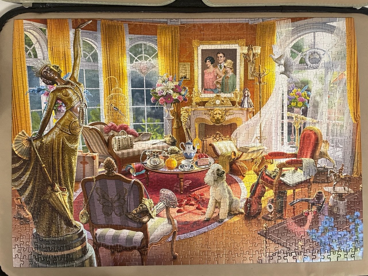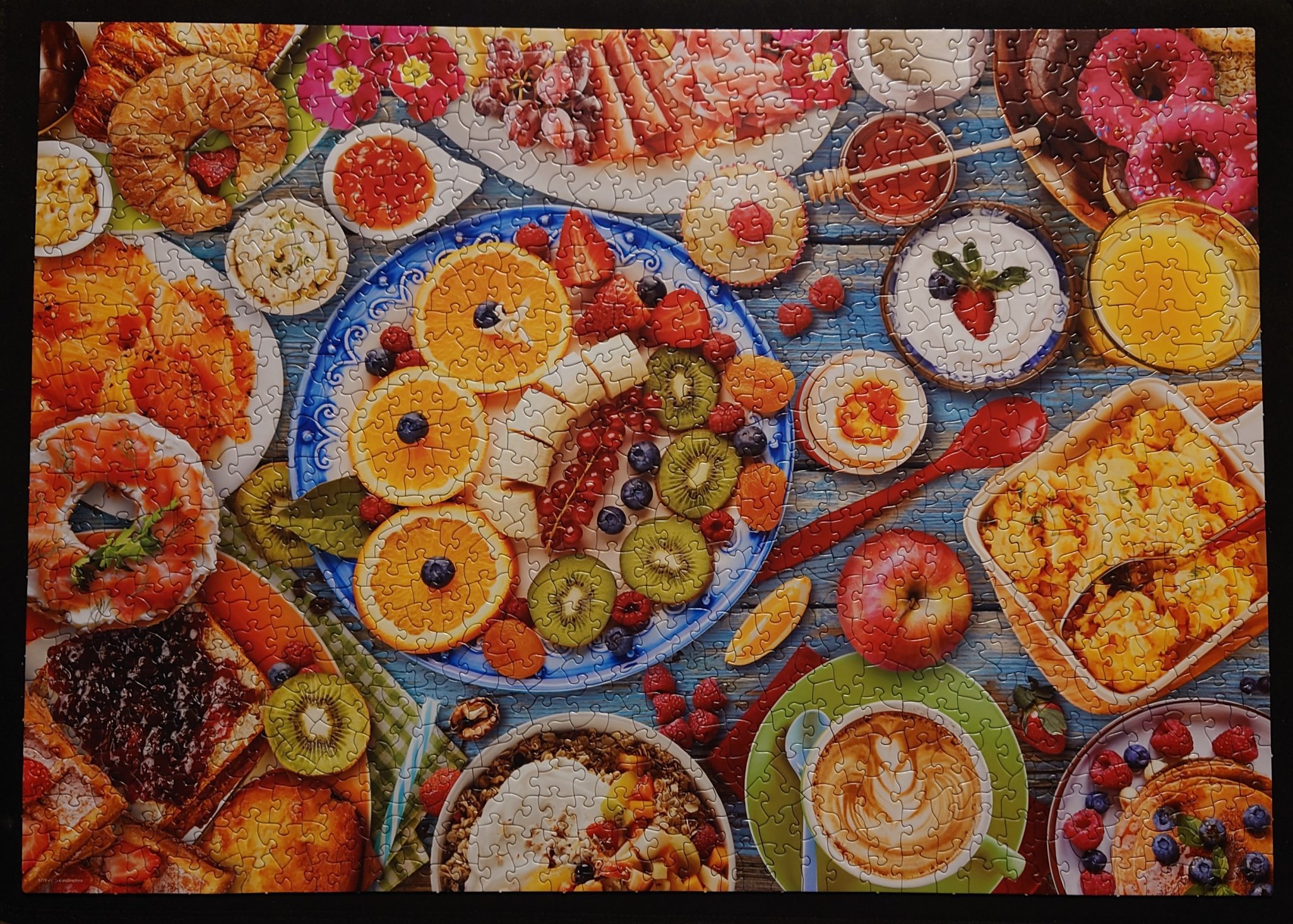 Факт е, че не преброих купчинките като бройка, защото предположих, че общо частите са 1008 и липсва една или някъде сме допуснали грешка. А защо 1008? Защото преди това наредих няколко Равенсбургера и на тях отгоре на кутията пише 1000, но отстрани пише 1008 части, което явно е точната бройка.