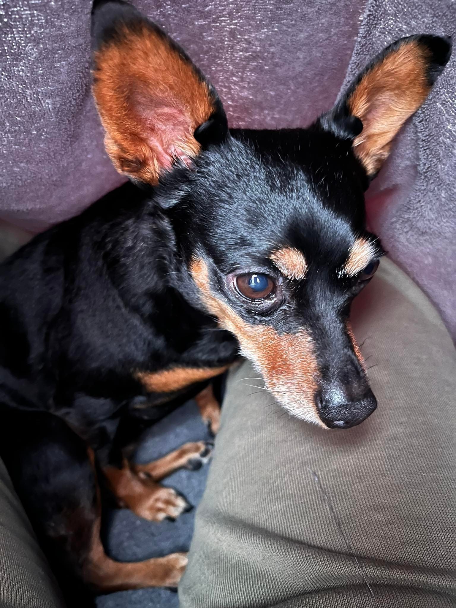 Малко куче след голям (т.е. изморителен) ден. Весе, тя се прибра, легна си в леглото и заспа; малко по-късно ме издебна, че седнах на дивана за две минути и се навря при мен. Откърти като някой пор, а така ме погледна като я отвих