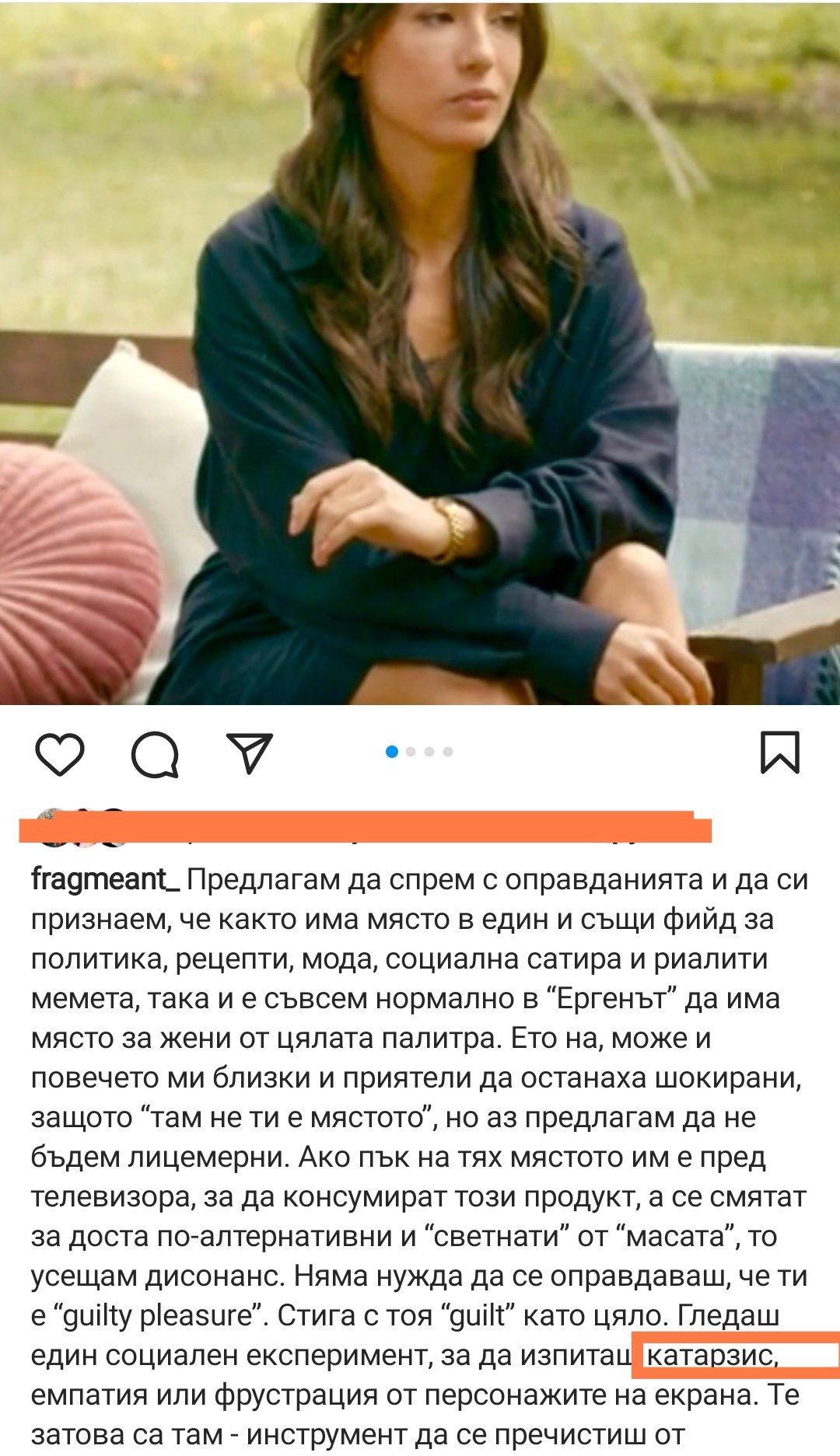 Това наистина ме уби. Grinning Хората, които искат да не ги бъркат с масата, твърдят че гледат с цел “дневна доза криндж” и като “гилти плежър”, но Елена и алтернативните и приятели са няколко нива нагоре - те гледат за катарзис.
