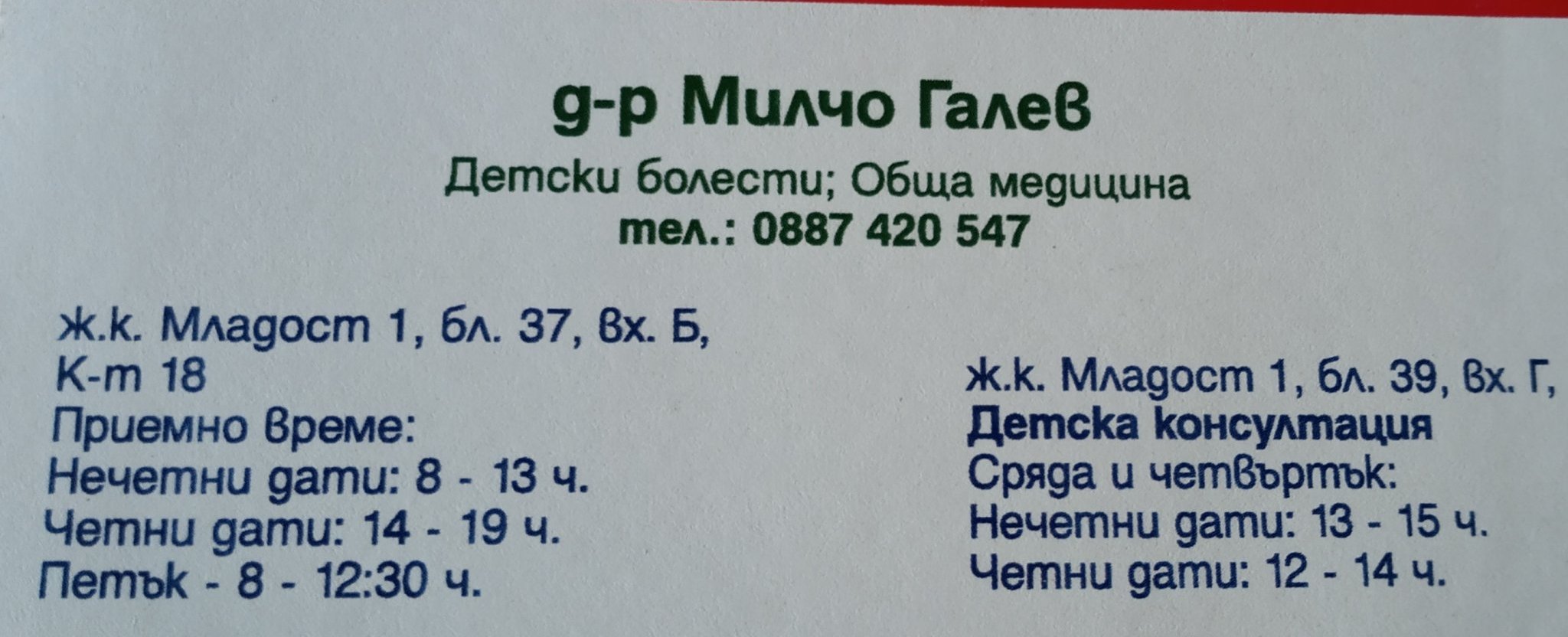 Здравейте, дали някой може да ми даде инфо за работното време на д-р Милчо Галев, поликлиника Младост? Благодаря предварително Simple Smile