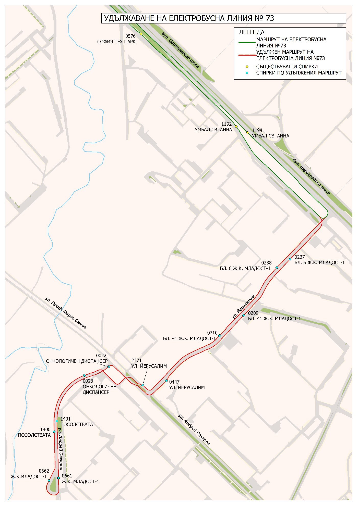 Считано от 26.07.2023 г. се удължава маршрута на електробусна линия № 73 до крайната станция в ж.к. Младост 1 както следва: от ж.к. Овча купел 2 по действащия маршрут до кръстовище бул. „Цариградско шосе“/ул. „Йерусалим“, надясно по ул. „Йерусалим“ и надясно по бул. „Андрей Сахаров“ до обръщателното колело в ж.к. Младост 1 двупосочно.