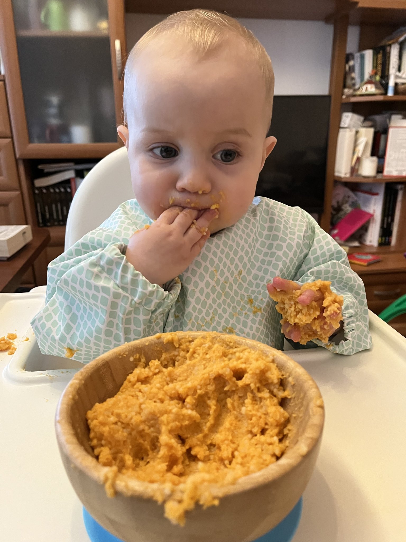 Щях да ви казвам, като ходя на йога ММ го храни - и ми се хвали как не бил оцапан/омазан както е след моето хранене. Викам, алоууу, нали знаеш че трябва да му даваш да се цапа, да бърка в купичката, да взима лъжицата, за да стимулираш менталното развитие…кел файда като си го опазил да не се цапа…