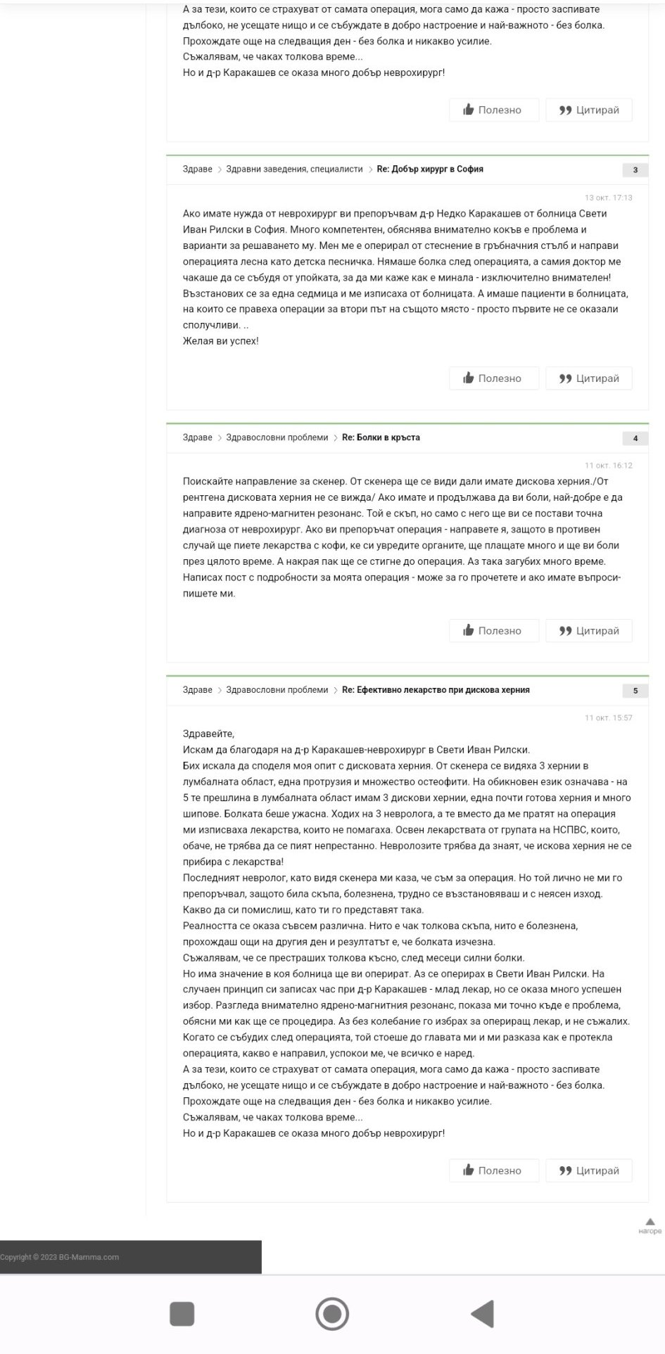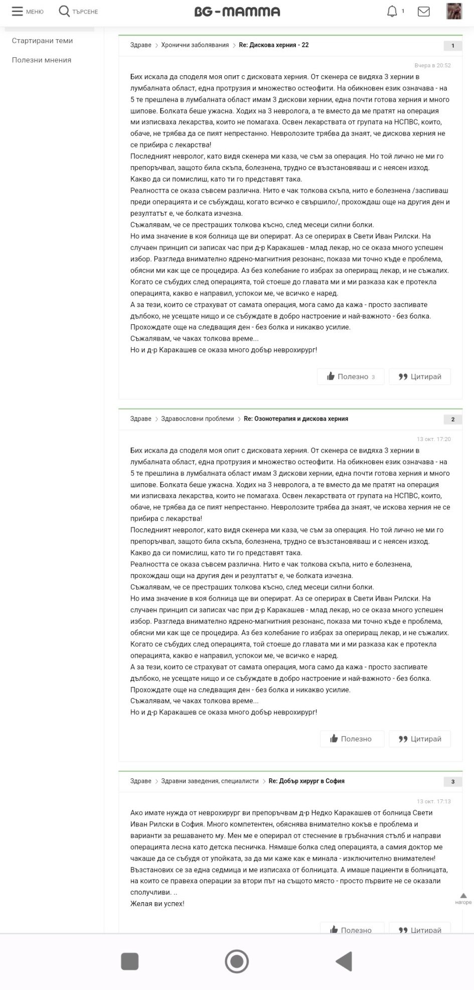 Но има значение в коя болница ще ви оперират. Аз се оперирах в Свети Иван Рилски. На случаен принцип си записах час при д-р Каракашев - млад лекар, но се оказа много успешен избор. Разгледа внимателно ядрено-магнитния резонанс, показа ми точно къде е проблема, обясни ми как ще се процедира. Аз без колебание го избрах за опериращ лекар, и не съжалих. Когато се събудих след операцията, той стоеше до главата ми и ми разказа как е протекла операцията, какво е направил, успокои ме, че всичко е наред.