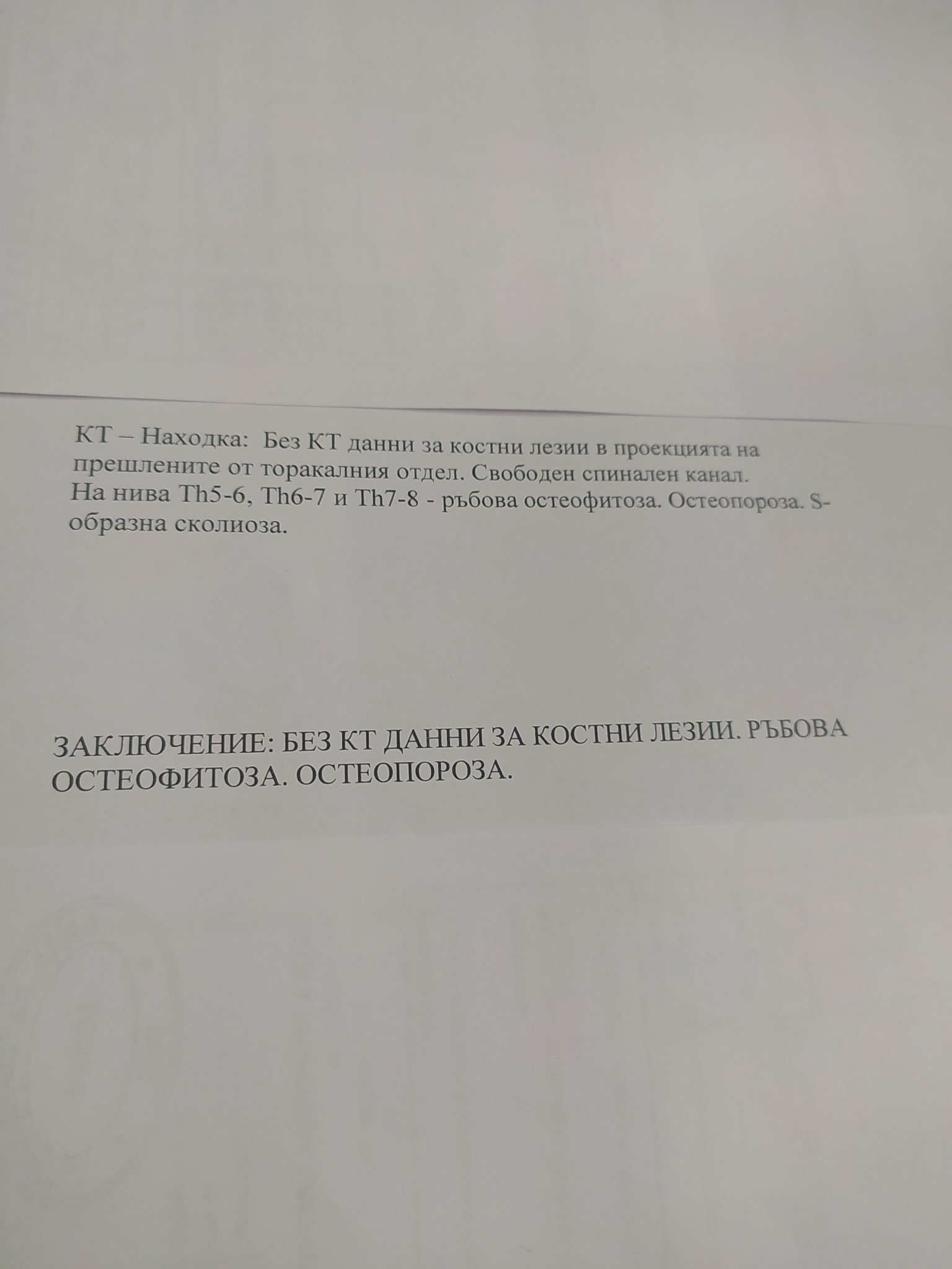 Приплъзване на прешлен. В комбинация с остеопорозата и сколиозата, трябва много да се пазиш от падания и наранявания, защото гръбнакът ти е много нестабилен. Проблеми с дисковете не пише да имаш, но ти си направила ямр (ако въобще е ямр това КТ) само на торакалните. Другото е рентгенография на лумбални, а на рентген не могат да се видят хернии. Имаш и шипове и на торакални и на лумбални прешлени, което се свързва с болки. Препоръчително е да си направиш ямр.