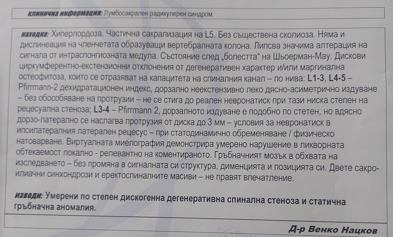 Заключение от ЕМГ данни за релативно по ниска амплитуда на моторния отговор от н.фибуларис синитра спрямо действа. Липсват аксонни неяропатии и тунелна патология. Вторична предно коренчева увреда на ПДН по Л5 С1 двустранно