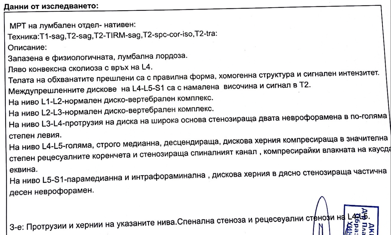 Заради L4-5, ако правилно е разчетено, наистина изглежда, че си за операция. Въпреки че се чувстваш сравнително добре, може изведнъж да се влошиш заради притискането на спинален канал и кауда еквина.