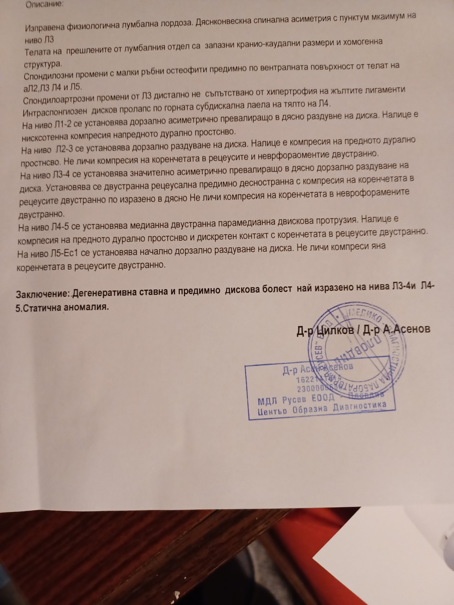 Благодаря  много  за мнението.Аз разбрах вече какво ми има по -много  неприятен начин.През нощта имах страшна болка в десния крак и невъзможност за ходене.Болката беше 10 от 10 .Направо полудявах и виех  от болка и отидох до спешното отделение.Лекарят там ми каза,че имам 2 херния.Едната голяма ,а другата малка.Точно малката е  засегнала нервните коренчета.Биха ми Урб@зон и ми изписа Линеф@р и Нелг@зин.Аз бях пила  НПВП.Дори 1ч.преди да отида и течен @налгин.Незнам как и дали ще се оправя.Отчаяна съм.