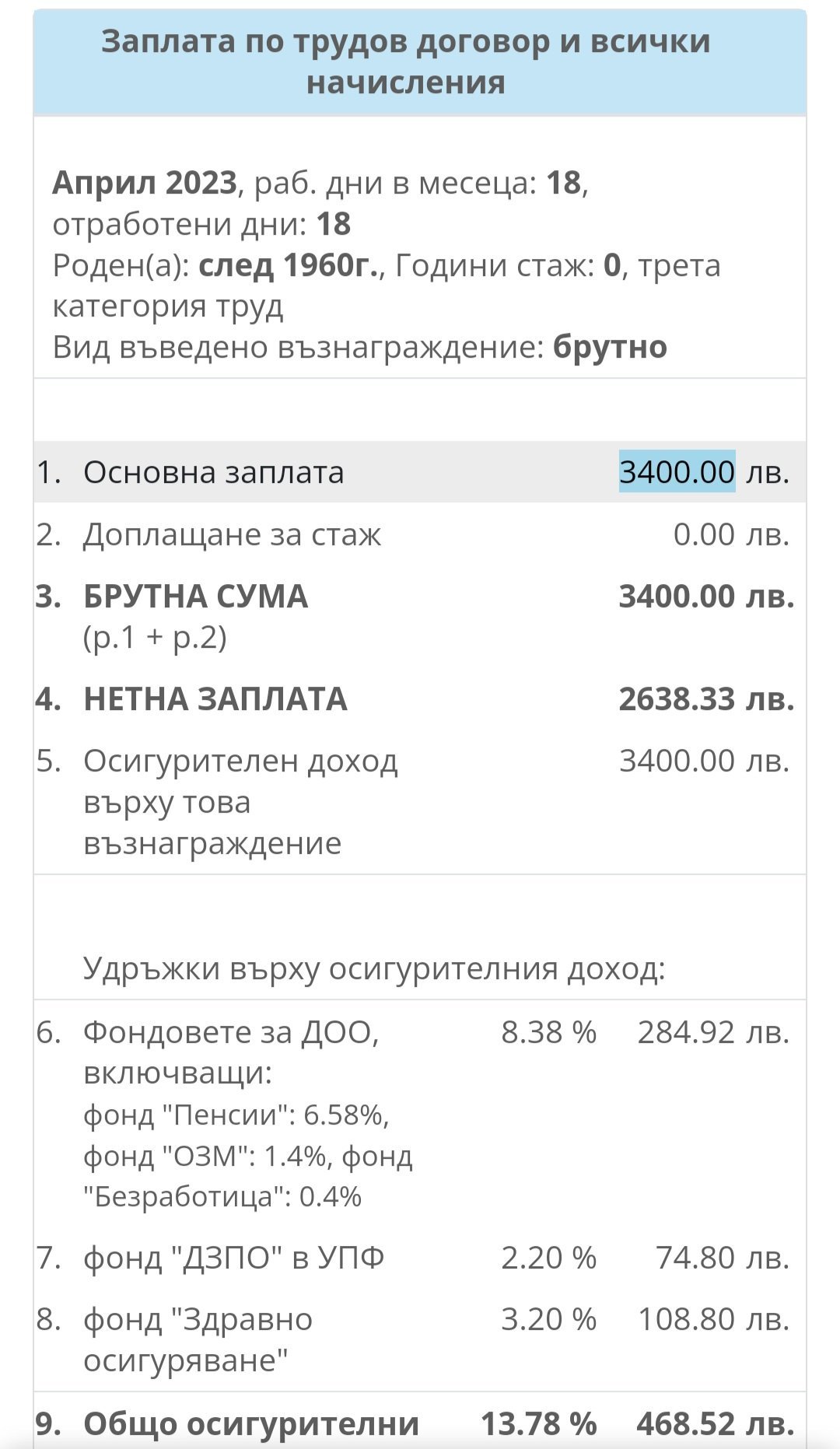 3,2 % от работника, т.е. 108 лв , но и 4,8 % работодателя плаща, т.е още 163 лв. Общо 272 лв. на месец.