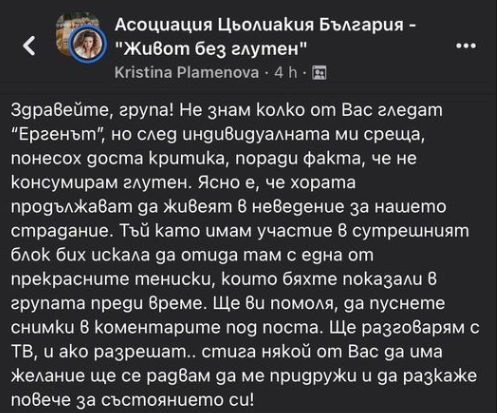 Аз подкрепям Кристина в случая. Глутеновата ентеропатия не е шега, а сериозно заболяване и е малоумно, ако някой се е подигравал и я е критикувал как не консумира глутен. Хубаво е да се ползват телевизионните изяви и за нещо полезно. Браво на нея!