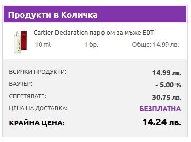 Цената в парфюми-шоп е прекрасна,  с код love10 стана 112 и стотинки, като доставката е безплатна. Обадиха ми се да потвърдят, че го изпращат. Нетърпеливо ми е, даже ако можех, щях да го ползвам още днес.