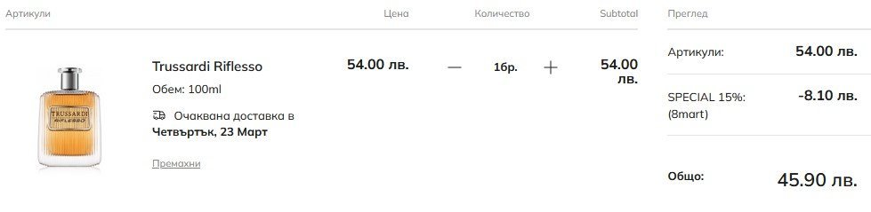 На мен в кошницата ми е останал въведен код, който ми намали цената с 10%, но накрая преди да завърша си изчисли редовната цена +доставки, опаковки и т.н, цената от 79лв с отстъпка скочи на 96. Е, отказах се.