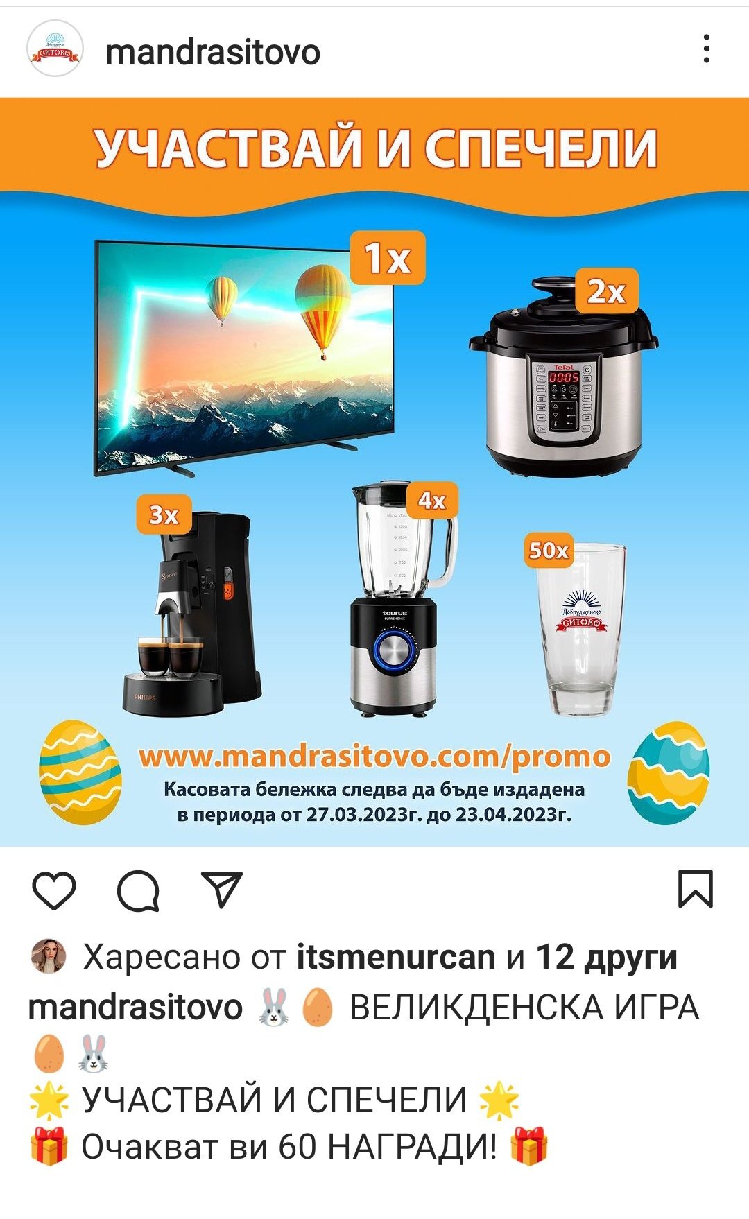 Купи продукти на "Мандра Ситово" без значение на каква стойност , регистрирай касовите бележки и можеш да спечелиш 1 от 60 награди 🎁