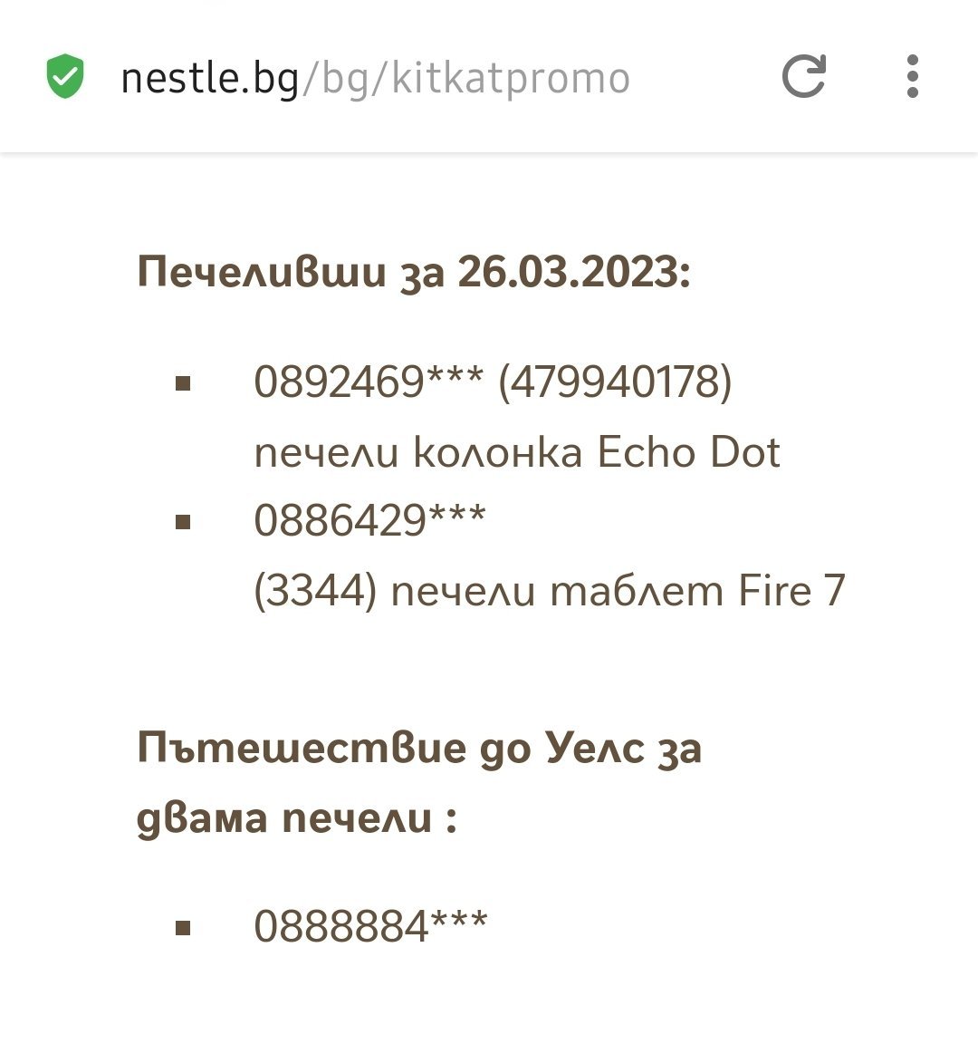 Последните печеливши в Киткат са публикувани, само че според правилата им трябваше на 26.03. да изтеглят 4 таблета и 4 колонки, а не по един брой от вид, както е в действителност. Губят им се общо 6 печеливши така...