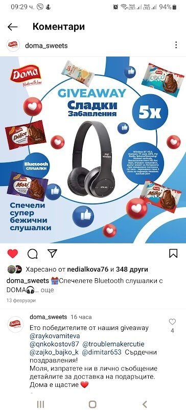 А и в отговор на една друга съфорумничка ще отговоря с печелившите от игра в ИГ на Doma sweets за Bluethoot слушалки