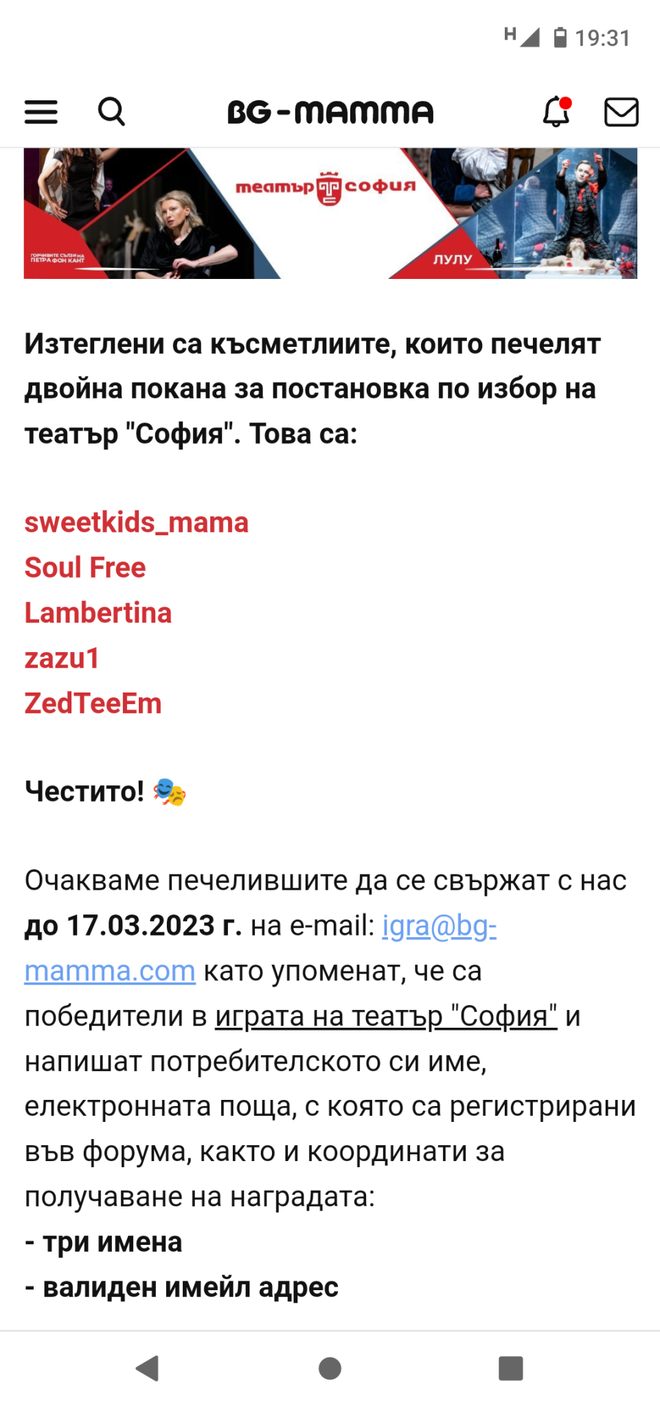 Аз спечелих от Коледните късмети Двойна покана за Театър София.
