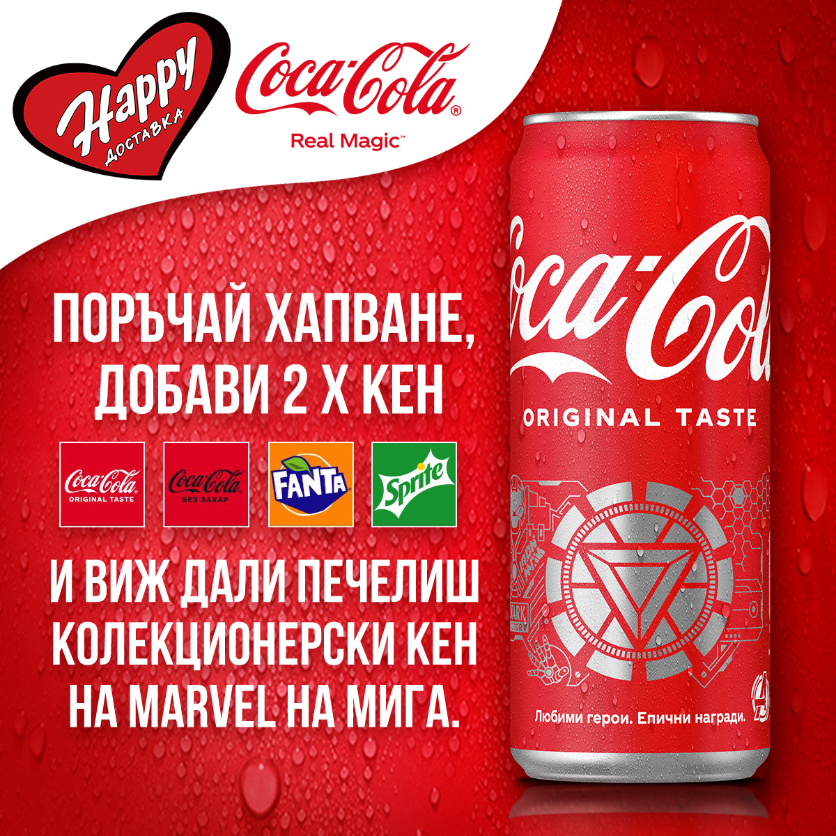 „ПОРЪЧАЙ ОТ HAPPY DELIVERY ДОБАВИ 2 БР КЕН COCA-COLA И МОЖЕШ ДА СПЕЧЕЛИШ КОЛЕКЦИОНЕРСКИ КЕН НА MARVEL"