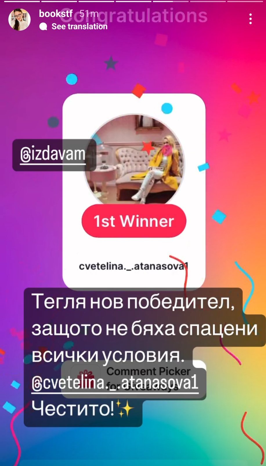 Не съм аз изтеглената, но ми допада, че за разлика от много инстаграм профили, наистина следи за коректно участие.