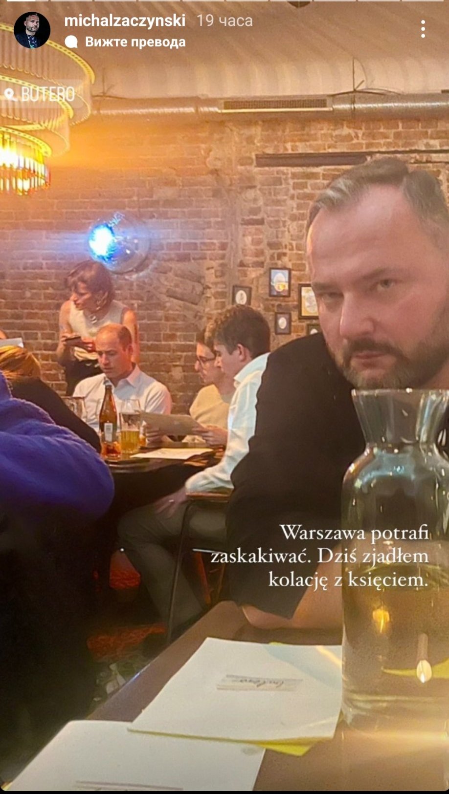 Според статията тук Уилям се е присъединил към свои служители в ресторант в Полша