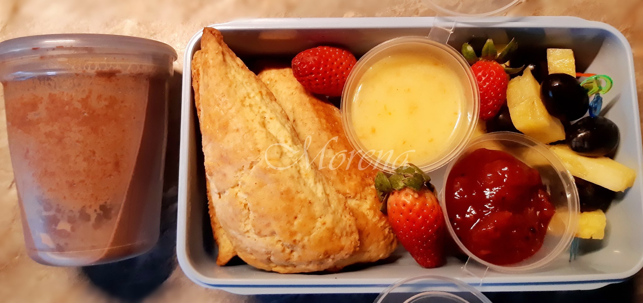 З - Страхотни портокалови скони/кифлички с плодов сос и захарна глазура като сос;  шоколадово мляко  за пиене;   шишчета с ананас и грозде