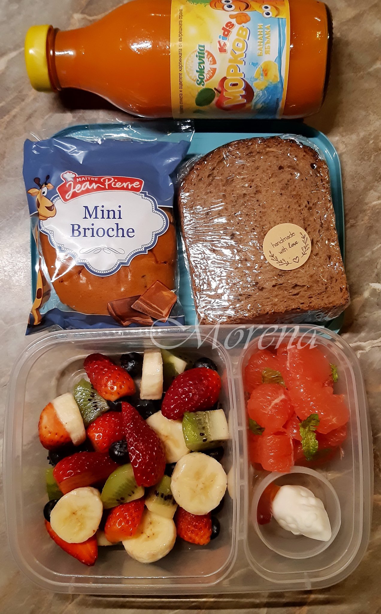 З - спестих си снимката   - Смути мюсли с авокадо, банан и какао;   Бургер с домашно хлебче, кюфте, топено сирене, краставица и сосове;   ягоди и банан