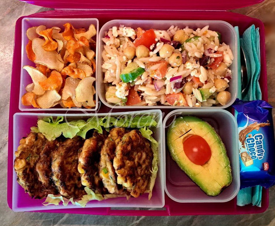 Обяд - Кюфтета от тиквички и царевица;  салата орзо с нахут, сирене  и зеленчуци с млечен дресинг;  домашен чипс от моркови и земна ябълка; авокадо и десертче