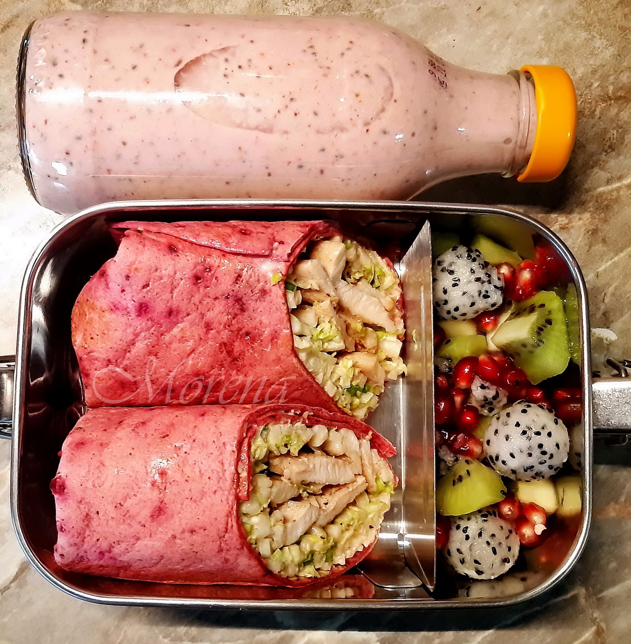З - Смути мюсли с банан и горски плодове;   Тортила със салата с пилешко и китайско зеле със сусамов дресинг;   драконов плод, киви и нар