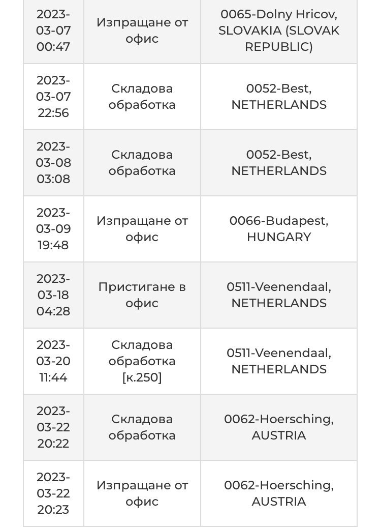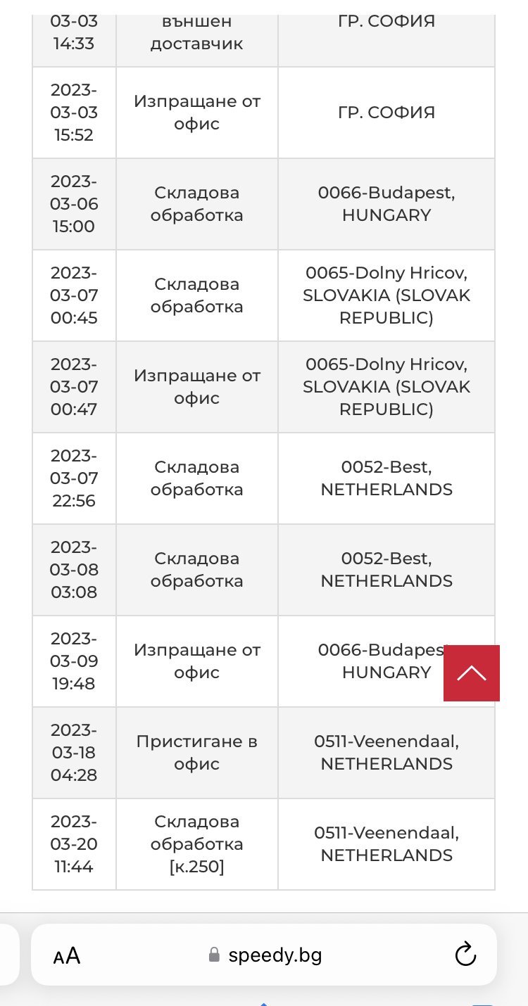 Здравейте! Аз имам друго питане! На някой да НЕ са доставяли колет? Как се процедира в такава ситуация? 🤔 Изпратих колет на 2 март със Спиди, съответно DPD. 10 дни търсихме къде точно се намира пратката (от 8 до 18 март) - нито в Бг, нито в Холандия знаеха къде е. Точно се появи в събота и в понеделник казаха, първо, че до 1-2 дни ще бъде доставено, и само след час, че я връщат в Бг, защото изпращача е поискал това (което не е вярно), или другата версия - бил минал срока за доставка и щом не е доставена за това време, значи трябва да се връща 😳 Нито мейлите, нито обажданията и в Спиди и в DPD помогнаха. Колетът се връща в България 🤦🏻♀