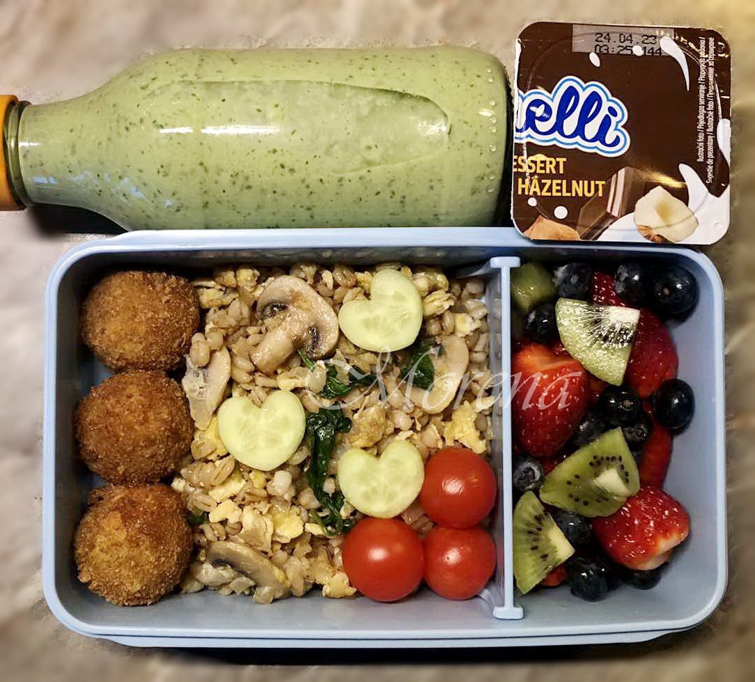 З - Перлен ечемик с яйца, гъби и спанак; броколи кфтенца; чери домати; шоколадово кремче; ягоди, киви и боровинки