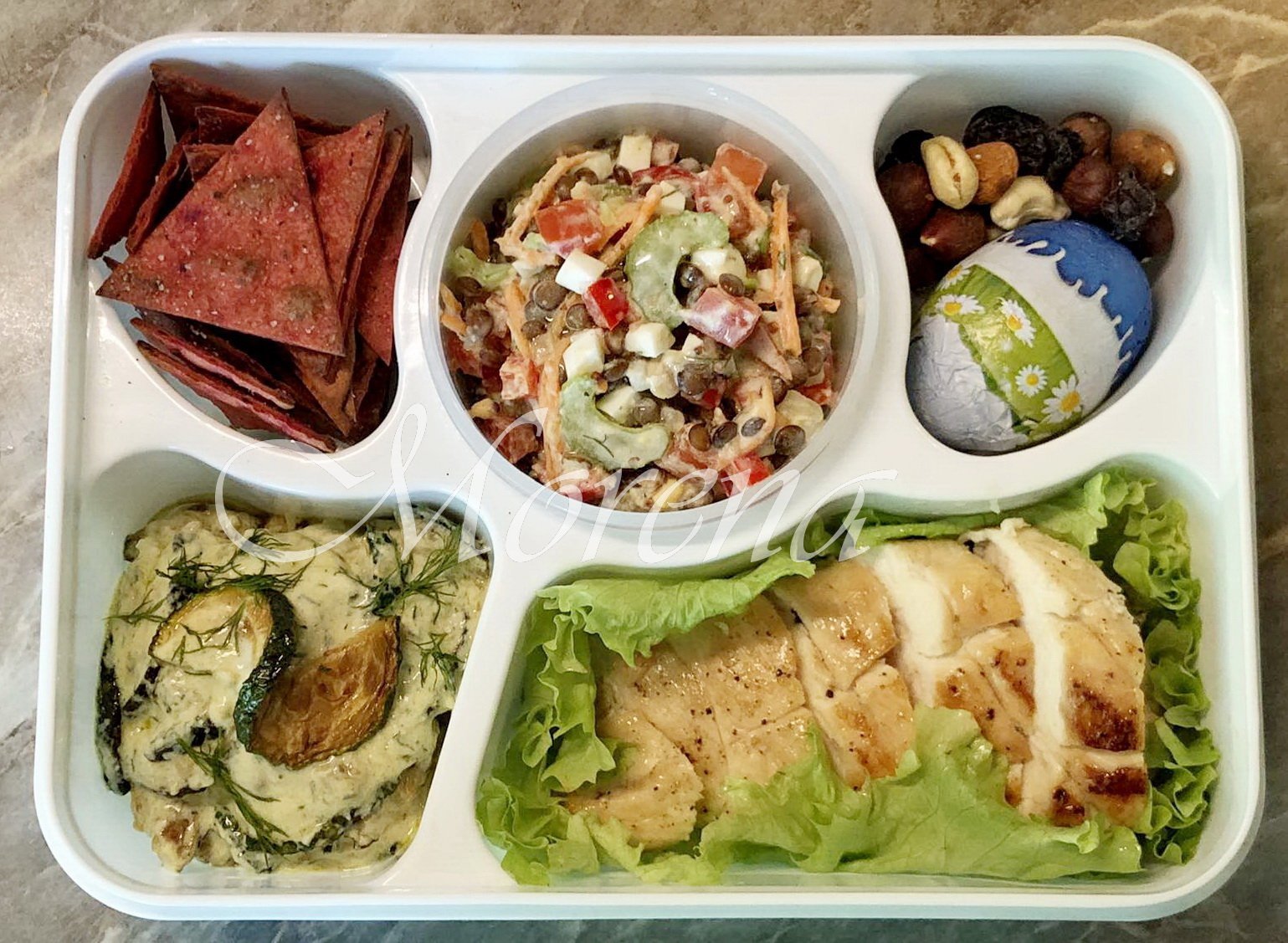 О – Пилешка пържола;  салата с леща, чери домат, яйце, морков, селъри, зелен лук и кис. краставичка; домашен тортила чипс; тиквички с млечен сос; шок. яйце, ядки и суш. плодове