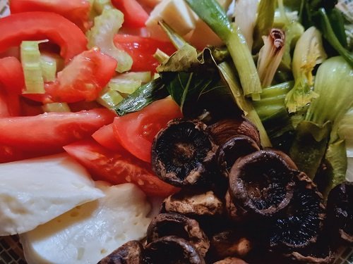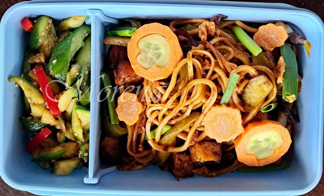О - Тофу, с нудли, чушка, лук и краставица; салата – краставица