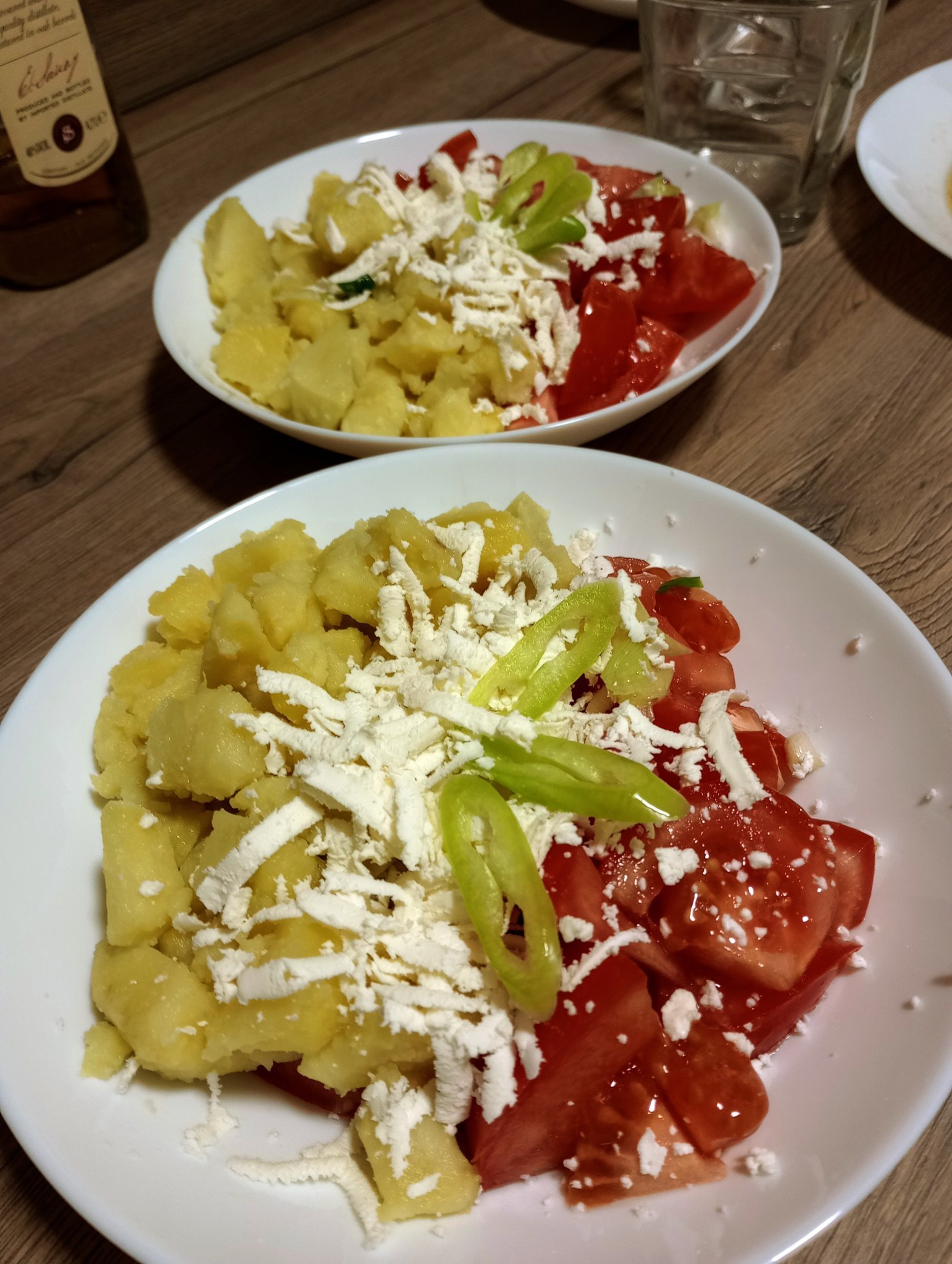 Салати-картофена със зелен лук и доматена с чушка и сирене