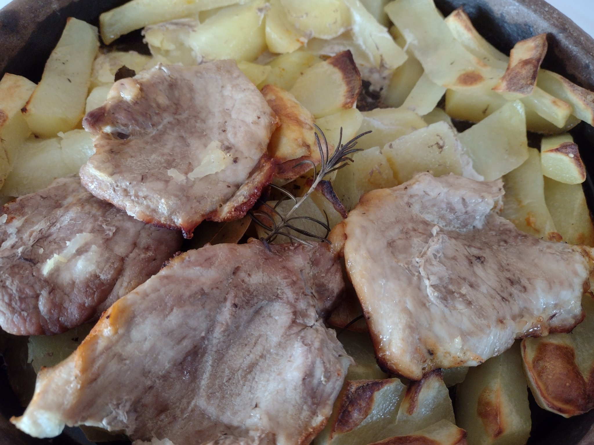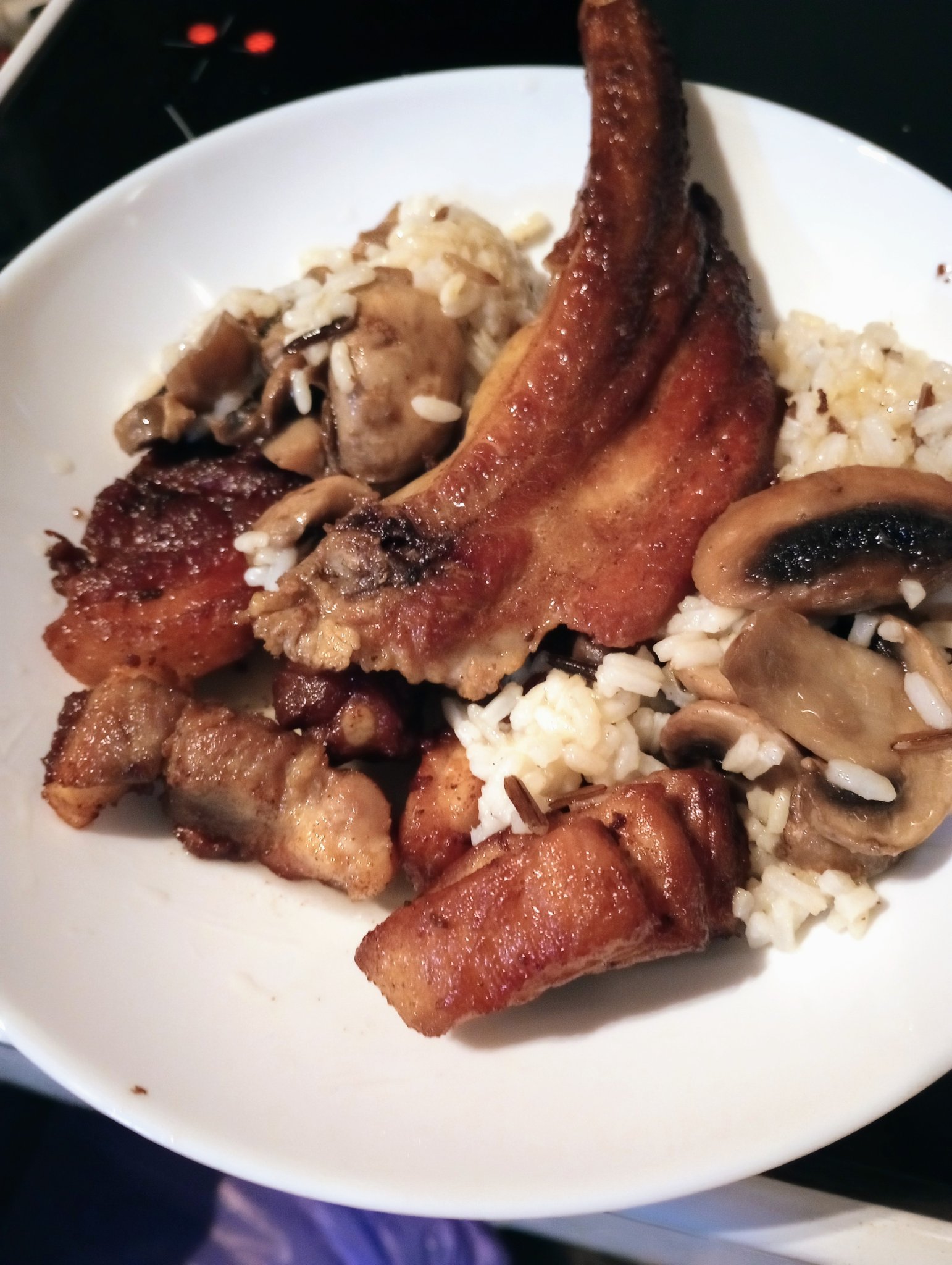 Печени свински гърди с гарнитура от перлен и див ориз с печурки