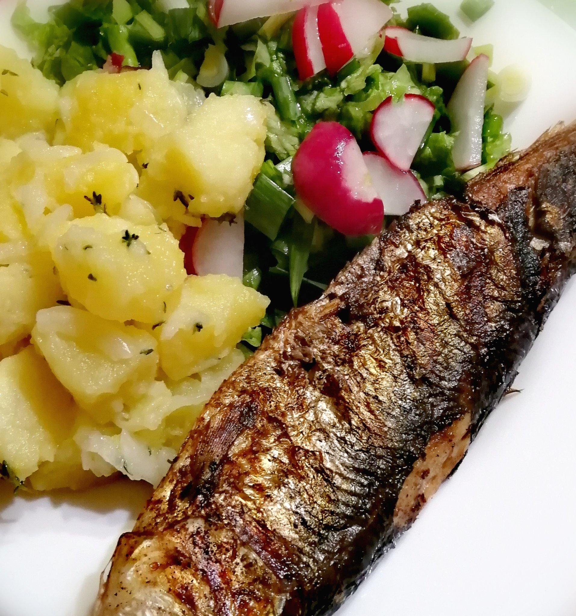 Карагьоз на скара, картофена салата с прясна мащерка и лук (трябваше да е червен, ама беше дал фира, инак много ходи на картофите с мащерката) и зелена салата с репички:
