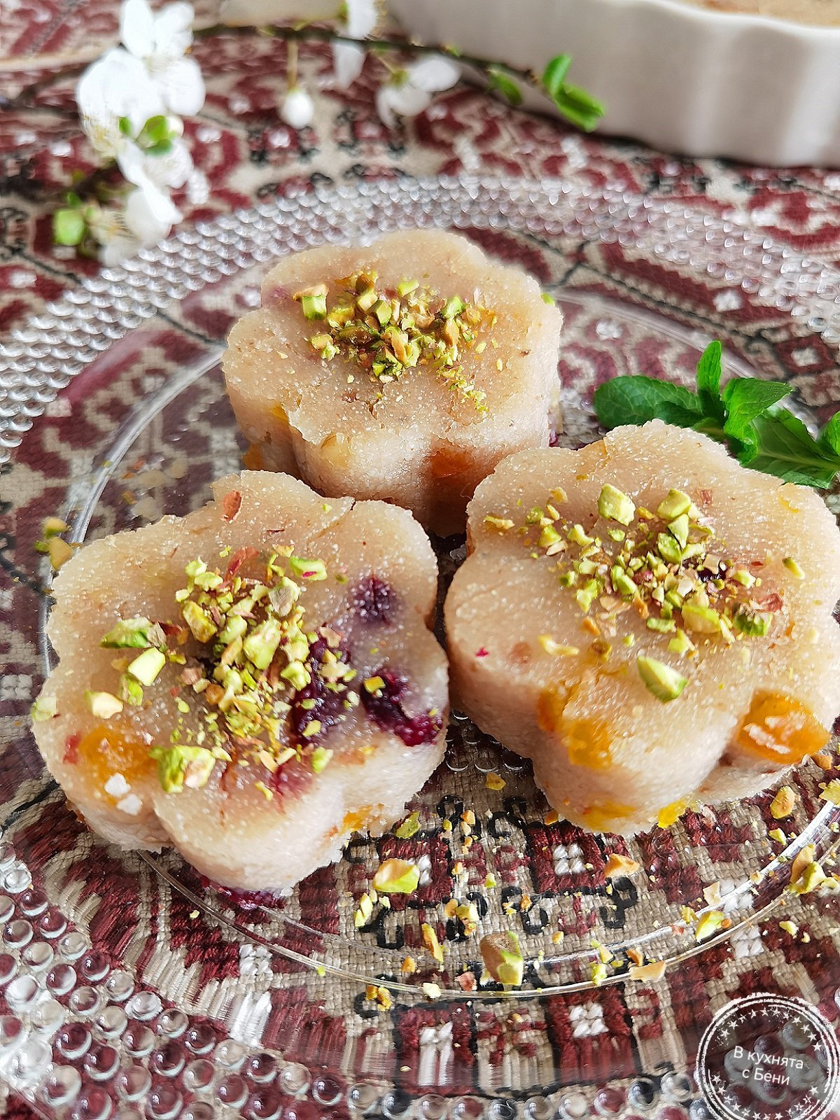 Грис халва с любимите ми сушени плодове и с лек цитрусов вкус приготвих за десерт днес. 😋🥧🍑🍒