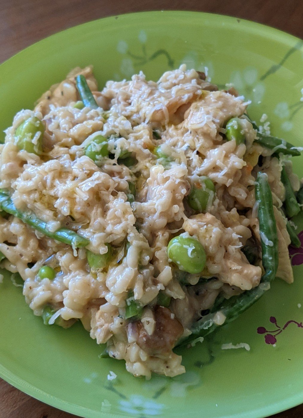 Ризото с пиле, манатарки, зелен боб и едамаме (творение на мъжа ми)
