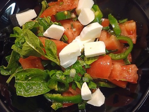 Салата от домати с моцарела и първите листенца спанак и киселец от домашната градинка