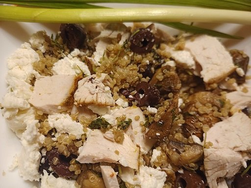 Същата салата като основно с добавки - домашна пуешка шунка, козе сирене и маслини