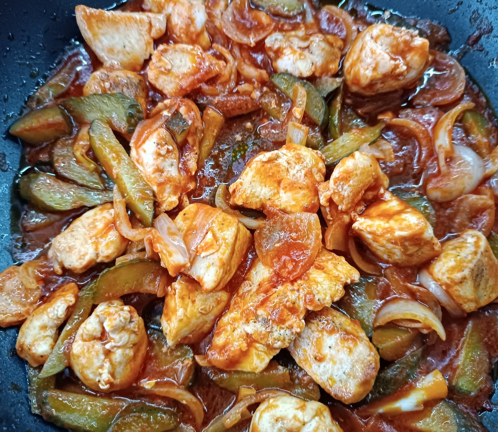 И на тиган,с лук,кисело краставички и доматено пюре: